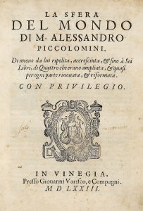 PICCOLOMINI ALESSANDRO, — La sfera del mondo [...]. — Di nuovo da lui ripolita, accresciuta & fino a sei libri, di quattro che erano amplaita... — In Vinegia : Presso Giovanni Varisco e Compagni, 1573. — In-4° (mm 210x150).