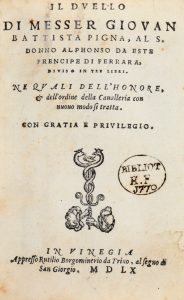 PIGNA GIOVANNI BATTISTA, — Il Duello [...] diviso in tre libri. Ne quali dell'honore, & dell'ordine della Cavalleria con nuovo modo si tratta. — In Venegia : appresso Rutilio Borgominerio da Trino, 1560. — In-8° (mm 148x98).