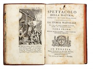 PLUCHE NOËL ANTOINE, — Lo spettacolo della natura, esposto in varj dialoghi concernenti la storia naturale [...]. — Tomo primo (-decimoquarto). — In Venezia : presso Francesco di Niccolo Pezzana, 1786. — 14 tomi in 7 volumi in-8° (mm 168x105).