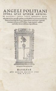 POLIZIANO ANGELO, — Opera. Quae quidem extitere hactenus, omnia, longè emendatius qua'm usquàm antehac expressa... — Basileae : apud Nicolaum Episcopium iuniorem, 1553. — In-folio (mm 225x205).