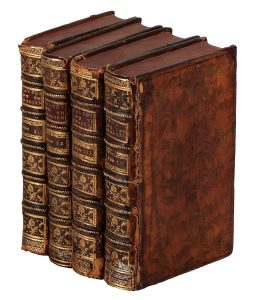 Legatura coeva in piena pelle maculata con cornice di filetto semplice impressa a secco ai piatti, e titoli dorati impressi ai dorsi a cinque nervi, comparti riccamente decorati in oro. Rotture alle cerniere e tarli ai dorsi dei tomi 3 e 4.