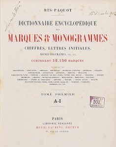 RIS-PAQUOT OSCAR EDMOND, — Dictionnaire encyclopédique des marques & monogrammes, chiffres [...] contenant 12156 marques. — Paris : Laurens, s.d. — 2 volumi in-8° (mm 275x210).