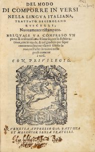 RUSCELLI GIROLAMO, — Del modo di comporre in versi nella lingua italiana [...] nuovamente ristampato. — (Al colophon : ) In Venetia : appresso Gio. Battista, & Melchior Sessa fratelli, 1563. — In-8° (mm 152x98).