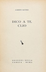 SAVINIO ALBERTO, — Dico a te, Clio. — Roma : Edizioni della Cometa, [1940]. — In-16° (mm 185x130).