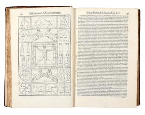 Con 2 frontespizi architettonici incisi in rame con ritratto dell'Autore in ovale, 2 frontespizi tipografici con grande marca xilografica e 87 illustrazioni incise sia in rame che in legno a piena pagina nel testo, di cui 8 a doppia pagina.