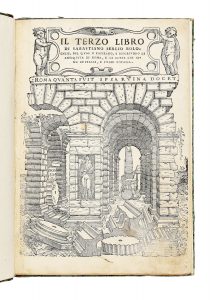 ─ BIBLIOGRAPHIE : Prima edizione del Terzo libro dell'Architettura del Serlio. Questo importante lavoro contiene i rilievi delle antichità romane in Italia (in primis Roma ma anche Tivoli, Ancona, Benevento, Spello, Verona, Pola) insieme a rilievi e progetti di importanti architetti del tempo come Bramante e Peruzzi.