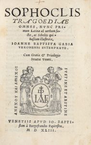SOPHOCLES, — Tragoediae omnes, nunc primum Latinae ad verbum factae, ac Scholijs quibusdam illustratae, Ioanne Baptista Gabia Veronensi interprete. — Venetiis : Apud Io. Baptistam à Burgofranco, 1543. — In-8° (mm 160x105).