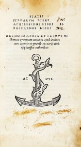 ─ BIBLIOGRAPHIE : Seconda edizione aldina in ottavo di questa raccolta di opere di Stazio, la cui princeps era stata impressa nel 1502. Nel volume viene riprodotta la dedica originale di Aldo a Giovanni Pontano e viene apposta una prefazione di Francesco d'Asola, figlio di Andrea, nella quale egli assicura che il libro è stato «diligentius multo quam antea impressum», sebbene in realtà il testo di Stazio non presenti effettive variazioni, né sensibili miglioramenti rispetto a quello del 1502. Adams A-1672 ; Renouard 35 : 7.