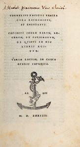 TACITUS PUBLIUS CORNELLIUS — Tacitus exacta cura recognitus, et emendatus... 1534 — (Al colophon : ) Venetiis : in aedibus haeredum Aldi Manutii romani et Andreae Asulani soceri, 1534. — In-4° (mm 220x130).