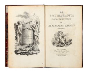TASSONI ALESSANDRO, — La secchia rapita. Poema eroicomico. — Tomo Primo (-secondo). — In Parigi : appresso Lorenzo Prault e Pietro Durand, 1766. — 2 volumi in-8° (mm 225x138).