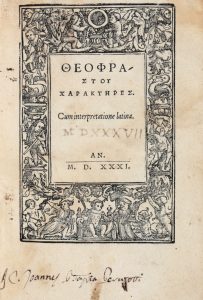 THEOPHRASTUS, — Charakteres. — Cum interpretatione Latina. 1531 — (Al colophon : ) Basileae : In officina And. Cratandri, mense septembri, 1531. — In-8° (mm 155x98).