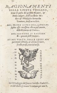 TOMITANO GIULIO BERNARDINO, — Ragionamenti della lingua toscana... — (Al colophon : ) In Venetia : per Giovanni de' Farri & fratelli, al segno del Griffo, 1545. — In-8° (mm 150x100).