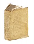 Legatura coeva in pergamena di riuso con una lacuna riparata al piatto anteriore e le sguardie iniziali rinnovate..