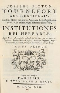 TOURNEFORT (de) PITTON JOSEPH, — Institutiones rei herbariae. — Editio tertia. Appendicibus aucta ab Antonio De Jussieu [...]. — Tomus primo (-tertio). — Lugduni iuxta exemplar Parisiis : è typograpia regia, 1719. — 3 volumi in-4° (mm...