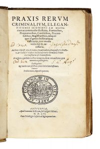 Van DAMHOUDER JOOST, Praxis rerum criminalium elegantissimis iconibus ad materiam accommodis illustrata… — Antuerpiae : Ioannes Bellerum, 1556. — In- 8° (mm 170x100).