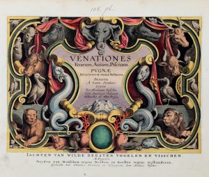 Van DER STRAET (detto Stradano) Jan, — Venationes ferarum, avium, piscium. Pugnae Bestiariorum & mutuae bestiarum depictae... — [Antwerpen] : Nicolaes Visscher, [ma Inghilterra, dopo il 1818]. — 2 opere in 1 volume in-folio oblungo (mm 360x265).