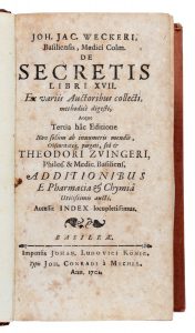 WECKER JOHANN JACOB, — De secretis libri XVII. — Ex variis authoribus collecti, methodicè digesti... — Basileae : apud Johan. Ludovici Konig. typis Joh. Conradi à Mechel, 1701. — In-12° (mm 175x90).
