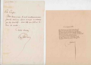 2 lettres autographes signées. S.l.n.d.– À Auguste Eugène Vatel, directeur du Théâtre-Italien. « Mon cher Vatel, s'il y a encore des loges de 1res pour le concert de listz [sic] ayez la bonté de m'en faire choisir une de votre main... Je la voudrais de quatre places seulement et des premières, bien entendu. » (1 p. in-12). – À un « cher confrère ». « Mille bonnes grâces. Je n'ai malheureusement pour le moment à vous envoyer en échange que des anecdotes – mais telles que je les ai, je vous les envoie... » Joint : Dumas père (Alexandre). Manuscrit intitulé « À une jeune fille ». « Que cherches-tu sur notre terre étrange / Esprit du ciel perdu dans nos chemins... » (huitain de décasyllabes sur 1/2 p. in-12 carré). Extrait du poème « L'Ange de poésie » composé en 1833 pour Marie Manessier-Nodier.