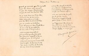 Poème autographe signé intitulé « Coquetterie posthume ». 8 quatrains d'une fine écriture serrée sur une page in-12 oblong. Pièce de vers originellement parue dans La Presse du 4 août 1851, intégrée l'année suivante par Théophile Gautier dans son recueil Émaux et camées (pp. 39-41) : « Quand je mourrai, que l'on me mette Avant de clouer mon cercueil, Un peu de rouge à la pommette, Un peu de noir au bord de l'œil ; Car je veux dans ma bière close, Comme le soir de son aveu, Rester éternellement rose, Avec du kh'ol sous mon œil bleu... » Un hommage littéraire à sa maîtresse Marie Mattei. De 1849 à 1852, Théophile Gautier entretint une liaison avec cette poétesse d'origine italienne, riche et indépendante, et composa le présent poème au printemps ou au début de l'été 1851. C'est son ami l'écrivain Maxime Du Camp qui en révélerait le secret en 1887, dans sa préface à une nouvelle édition d'Émaux et camées : « l'appareil lugubre de la mort lui était odieux ; elle rêvait de conserver ses frêles élégances jusque dans la tombe : le poète cristallisa cette fantaisie et écrivit Coquetterie posthume ».