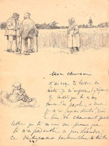 Lettre autographe signée à son « cher ami », illustrée de 5 dessins originaux (encre et plume) dont un signé de ses initiales. S.l., « mercredi soir ». 4 pp. in-12 carré. «  ... La charmante lettre que tu m'écris me prouve que tu n'as pas oublié ce gros Léandre, ce ventripotent barbouilleur de toiles, ton professeur, en somme !! Je gratte un grand navet pour (voir le Grd vocabulaire des ateliers) épater le peuple de Paris ! Je commence ma journée à 8 h. 1/2, et à 7 h. Je rentre au sein de ma famille pour partager avec elle ces mets succulents de beurre et de fromage dont l'abus inévitable me fait toujours payer un excédant quand je rentre à Paris au mois d'octobre. Il faut que ce navet soit terminé à la fin du mois. Je travaille donc tous les jours. Je ne vais pas te raconter toutes les difficultés presque insurmontables que peut donner un tableau. Ce qu'il y a de certain, et ce qui me navre, c'est que cela ne me fait pas maigrir ! J'ai fait l'ouverture de la chasse comme d'habitude sans fusil, un crayon dans ma poche, dont je ne me sers jamais. Ce jourlà, je suis et j'observe tous les mouvements du chasseur avec beaucoup d'intérêt. Je saute les haies et les fossés avec la légèreté qui me caractérise, tu le sais ! Et comme j'ai du nez (voir la gravure), je découvre souvent les bons gîtes aussi bien que le chien. Je donne même de la voix, ça ne te surprends pas, tu me connais...  » Les présents dessins, d'excellente facture, représentent une scène campagnarde, probablement à Champsecret dans l'Orne, à 3 figures paysannes en sabots (65 x 125 mm), un poupon tétant son biberon (30 x 45 mm), et un autoportrait devant sa toile (50 x 60 mm). Les deux croquis, amusantes caricatures, le représentent dans une scène de chasse (25 x 65 mm) et en médaillon de profil avec un nez démesuré (20 x 20 mm).
