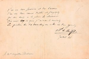 Poème autographe signé. Daté « juillet 46 ». Quintil sur une p. in-4 oblong, traces de colle au verso. Charmant quintil dédié « à Melle Augustine Brohan », comédienne qu'il rencontra en 1846 et avec qui il entretint une relation d'amitié amoureuse. Il lui dédia également une « Chanson » (« Bonjour, Suzon, ma fleur des bois »). Le présent poème parut d'abord le 5 novembre 1850 dans le Journal des femmes, puis fut publié en fac-similé sous un portrait d'Augustine Brohan dans le n° 5 du Décaméron dramatique, périodique dirigé par Jacques Offenbach alors chef d'orchestre de la Comédie-Française. Il fut enfin intégré en 1866 dans les Œuvres posthumes du poète (Paris, Charpentier, Œuvres complètes, t. X). « J'ai vu ton sourire et tes larmes, J'ai vu ton cœur triste et joyeux. Qui des deux a le plus de charmes ? Dis-moi ce que j'aime le mieux, Les perles de ta bouche ou celle de tes yeux. »