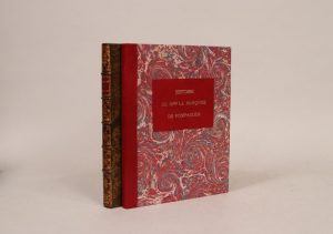 Manuscrit intitulé « Histoire de madame la marquise de Pompadour ». Probablement fin du XVIIIe siècle. 43-38 pp. in-4, de deux mains différentes, en 2 cahiers brochés ensemble sous couverture de papier dominoté. Le tout placé dans une chemise à dos de veau rouge avec pièce de titre sur le premier plat, sous étui bordé (chemise et étui modernes). Violent pamphlet contre la marquise de Pompadour, qui est dépeinte sous les traits d'une intrigante sans morale, sans vision politique, et même, en 1758, sans beauté : « ... Ainsy elle avoit touttes les raisons du monde de triompher et de se féliciter d'avoir sçu choisir l'unique sûr[e] voye qui s'offroit de captiver le roy et de s'en assurer la conqueste... Ce secret consistoit uniquement à saisir l'humeur du roy et à prendre à tâche de s'y conformer en tout. De là venoit qu'il ne trouvoit nul[le] part de plaisir plus grand que dans sa compagnie. ce n'est ny la grande beauté ny le grand esprit qui conduit à ce but, c'est plutôt une sage discussion qui ose sacriffier à la complaisance, une esprit personnellement intéressée qui, surtout dans des bagatelles, dans de petits caprices, dans de sotte[s] passion[s], préfère toujours sa satisfaction particulièr[e] à celle des autres... » (première partie, p. 28). Ce texte, qui se présente comme achevé en 1758, fut publié en 1759, dans une impression hollandaise sous l'adresse fictive de S. Hooper à Londres – il en parut une traduction anglaise, concurremment ou peut-être même un peu avant. Le présent manuscrit a été établi sur papier d'Auvergne filigrané « Gourbeyre » et daté « 1742 », mais ce millésime continua à être placé en filigrane sur des papiers fabriqués bien après, parfois jusque dans les années 1780. En fait, la présente copie a probablement été établie à l'époque où Marie-Antoinette faisait à son tour l'objet d'une violente campagne de libelles. Une mystérieuse femme de lettres, « Mademoiselle de Falques ». Dite aussi Mademoiselle de Fauques, avec ou sans « s » final et avec ou sans particule, elle était née Marianne-Agnès Pillement (1720-1804), dans le Comtat-Venaissin, peut-être à Avignon, vécut un temps en Angleterre, et publia des contes dans les années 1750-1770. On sait peu de choses d'elle mais sa vie fut entourée de rumeurs : Quérard, par exemple, en fait la sœur du peintre et graveur Jean Pillement, et l'épouse de l'agent de change Charles Falque qui fut pendu pour faux, avant d'indiquer que, veuve, elle mena une vie aventureuse, de « catin, même, sous le nom de comtesse de Clermont ». Il la fait se défenestrer en 1773. Provenance : bibliothèque de l'historien Amédée de Caix de Saint-Aymour. Joint, un volume imprime, édition du texte établie sur le présent manuscrit (Paris, Mercure de France, in-8, demi-basane dans le goût du XVIIIe siècle, tirage sur vergé, probablement hors commerce).