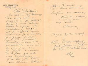 Lettre autographe signée en deux endroits, « Renoir » et « R. », adressée au médedcin, historien et critique d'art Élie Faure. Cagnes-sur-Mer, 31 mars 1914. 2 pp. in-12, enveloppe. « cher docteur, je serais très heureux de Vous Voir à cagnes où je resterai jusqu'à mon retour, mais le voyage entre Cavallère et Cagnes est si difficile que réellement je n'ose vous y engager. je serais content de pouVoir baVarder un peu aVec un parisien, mais je ne sais si je dois le désirer, à cause de la peine que cela vous donnerais. J'ai lu votre lettre avec plaisir, lettre pleine d'amitié et de bons souvenirs. Enfin, on verra. Bien amicalement à vous et aux amis... p.s. temps superbe, tout pousse, c'est la corne d'abondance... » Auguste Renoir avait découvert Cagnes-sur-Mer en 1898, et, enchanté, y était venu régulièrement avant d'y acheter le domaine des Collettes en 1907. Il y passa les hivers, aimant à s'occuper du jardin où il cultivait des rosiers, des orangers – Claude Monet lui offrit d'ailleurs des soleils pour ce jardin. Bien qu'il s'y sentît parfois un peu abandonné de ses amis parisiens, Renoir y travailla fructueusement à son art jusqu'à sa mort.