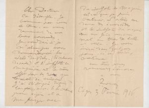 Lettre autographe signée « Renoir » au médecin, historien et critique d'art Élie Faure. Cagnes-sur-Mer, 3 février 1916. 2 pp. in 12, enveloppe. Corps périssable du peintre immortel. « Cher docteur, ça désenfle. Je commence par vous le dire, en vous remerciant de vos bons conseils, je voudrais, si je ne m'abuse pas, vous demander si les sels de Vichy (bicarbonate de soude) et le sulfate de magnésie ont le même effet sur les reins que le sel de cuisine. J'ai été soigné depuis longtemps avec ce bicarbonate pour digérer et à me purger avec du sulfate de magnésie. Est-ce que je puis continuer ? L'aloès me donne des émoroïdes et le sulfate de magnésie ne me fait aucun mal au trou de balle, et voilà. Je vous écrirai dans quelques jours, si ce mieux continue. Avec tous mes remerciements sincères, à vous... »