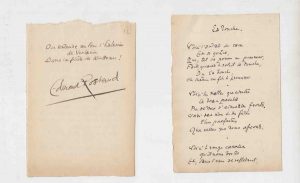 Poème autographe signé intitulé « La Touche ». 31 sizains de vers de 7 et 3 syllabes, occupant 11 pp. 1/2 in-12, sur bifeuillets scindés ultérieurement, ce qui oblige à tourner les feuillets deux à deux. Hommage à son ami le peintre Gaston de La Touche, paru en 1908 en préface au catalogue de l'exposition de celuici tenue à la galerie Georges Petit du 11 juin au 13 juillet 1908. Il serait intégré en 1922 dans le recueil posthume Le Cantique de l'aile (Paris, Fasquelle), avec infimes variantes. Gaston de La Touche collabora à l'illustration d'une édition de L'Aiglon en 1910, et signa le décor de la villa « Arnaga » d'Edmond Rostand à Cambo-les-Bains.