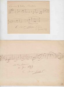 3 citations musicales, soit 2 autographes signées et une autographe. – Citation musicale autographe signée. Cadix, 15 janvier 1897. Air de Dalila à la scène 6 du premier acte de son opéra samson et dalila : « Printemps qui commence / Portant l'espérance / Aux cœurs amoureux » (9 mesures sur 2 portées, occupant 1/2 p. in-8, pour chant, sans texte, les 2 dernières mesures appartenant ici à l'accompagnement). Composée sur un livret de Ferdinand Lemaire, cette œuvre fut créée en allemand le 2 décembre 1877 à Weimar, puis en français le 3 mars 1890 à Rouen (elle ne fut représentée à l'Opéra de Paris que le 23 novembre 1892). – Citation musicale autographe signée. Utrecht, 10 juin 1897. Thème de l'allegro du premier mouvement de son poème symphonique la jeunesse d'hercule (8 mesures sur une portée occupant 1/2 p. in-8 oblong). Œuvre créée le 28 janvier 1877 au Théâtre du Châtelet à Paris. – Citation musicale autographe. Passage de l'air de Déjanire sortant la tunique de Nessus dans l'acte III de l'opéra déjanire : « J'ai chargé ce tissu de riches broderies, / L'or, les perles, les pierreries » (2 portées pour chant avec texte sur une carte de visite). Composée sur un livret que Camille Saint-Saëns écrivit en collaboration avec Louis Gallet d'après la tragédie de Sophocle Les Trachiniennes, cette œuvre fut créée le 14 mars 1911 à Monte-Carlo, et représentée à l'Opéra de Paris le 22 novembre suivant.