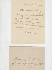 Lettre autographe signée « Soutine » au médecin, historien et critique d'art Élie Faure. S.l.n.d. 1 p. in-12, enveloppe. « Cher monsieur faure, excusez-moi d'aVoir tardé de Vous rendre le liVre de balsac, mais j'étais malade, sérieusement grippé. Bien sincèrement... » La compagne de Soutine dans les années 1937 à 1940, Gerda Groth a souligné dans ses mémoires que le peintre lisait les grands auteurs français comme Montaigne ou Racine (Mes années avec Soutine, 1973). Joint, une pièce concernant la location par Soutine d'un hôtel particulier, aux frais d'Élie Faure : « Reçu de Monsieur Sutine, la somme de cinq mille quatre cent cinquante francs en un chèque... au nom de Mr Faure à titre de commission forfaitaire sur la location de l'hôtel particulier que je lui ai procuré, 26 passage d'Enfert à Paris, et frais d'enregistrement du bail... » (Paris, 10 janvier 1930, 1 p. in-8 oblong dactylographiée avec ajouts manuscrits). Chaïm Soutine, qui changea souvent de logement, vécut de 1930 à 1936 dans cet hôtel particulier du quartier Montparnasse. « Vous étiez, Vous êtes encore, hors mes deux fils, le seul homme que j'aime » (Élie Faure à Soutine). Élie Faure, qui avait déjà remarqué son œuvre, rencontra pour la première fois Soutine au début de 1927. Il le considérait comme un génie « ivre de peinture », « le premier – de très loin – des peintres vivants », comme il l'écrivait et lui écrivait. Élie Faure accueillit Soutine chez lui, à Paris, à Bordeaux à la fin de 1927 et durant l'été de 1928, en Dordogne dans sa maison familiale durant l'été de 1929, à la suite de quoi il l'emmena en Espagne pour un voyage d'où Soutine revint enchanté. Élie Faure consacra une monographie au peintre en 1929 – la seconde à paraître après celle de Waldemar-George en 1926. Il lui acheta quelques toiles, dont un Bœuf écorché et une Volaille suspendue, et lui apporta un soutien financier en 1930. L'amitié qui liait les deux hommes était très forte, Élie Faure traitant Soutine comme un fils, mais une brouille les sépara au printemps 1930 : Soutine serait tombé amoureux de Marie-Zéline dite Zizou, la fille d'Élie Faure. Il en parla à ce dernier (qui semble avoir gardé le silence auprès de Zizou) mais tarda à se déclarer auprès de la jeune fille elle-même : quand il se décida enfin à le faire, celle-ci s'était entre temps engagée auprès d'un autre – d'où la furie de l'irascible peintre. Joint, le brouillon autographe signé de la réponse d'Élie Faure : « soutine (et non monsieur), Vous êtes d'une injustice atroce, que Vous regretterez – je l'espère pour vous – quand le calme sera rentré dans votre cœur. Nul ne vous a bafoué chez moi, nous avons été les uns et les autres victimes des circonstances et d'une imprudence commune où je ne vois rien qui puisse diminuer le respect que je vous garde et que vous me devez aussi... Est-ce là l'estime que vous inspirait ma fille ?... je Vous connais mieux que Vous ne Vous connaissez Vous-même, votre lettre n'existe déjà plus dans mon souvenir... Je ne souffrirais pas de votre abandon si je pouvais penser une minute qu'elle représente votre réelle nature. C'est en vousmême que vous chercherez le pardon de l'avoir écrite, et, j'aime à le croire, l'y trouverez. Ce jour-là, je vous accueillerai en homme chez qui "l'admiration" était devenue, depuis que je vous connaissais, le complément nécessaire de l'amitié. si, dans cette amitié, Vous n'aVez, Vous, senti que "l'admiration", ce serait pour moi une raison suffisante de Vous retirer l'une et l'autre, car cela me montrerait qu'il n'y aVait qu'un peintre exceptionnel là ou j'aVais cru trouVer un homme. et ce ne serait pas tant pis pour moi, mais tant pis pour Vous. jusqu'au jour – que j’espère proche – ou Vous Vous aperceVrez que l’humilité est la conquête même et le refuge de l'orgueil... Je vous attends donc avec confiance, des mois et des années s'il le faut. Vous étiez, Vous êtes encore, hors mes deux fils, le seul homme que j'aime... J'ai 57 ans. Je disparaîtrai peut-être sans que vous m'ayez pardonné le mal que nul chez moi n'a voulu vous faire, et dont je vous pardonne, moi, la vilaine interprétation. Mais si je meurs sans que vous soyez venu me dire que vous vous êtes trompé, non pas sur mon compte, mais sur le vôtre même, ce sera l'âme tranquille, avec la conviction que vous regretterez un jour de ne pas être revenu vers moi. Et c'est dans cette conviction qu'est la preuve de l'affection, du respect et de "l'admiration" qu'il ne dépend que de vous que je persiste à vous accorder. de loin, Votre peinture me dira si Vous demeurez l'homme que je Vois encore en Vous. en attendant, je reste Votre seul ami, et Votre solitude est ma souffrance...» « au moment où L'on m'outrage, iL ne faLait pas parLer de penture... »