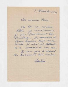 Lettre autographe signée « Soutine » au médecin, historien et critique d'art Élie Faure. Paris [d'après le cachet de la poste], 5 décembre 1930. 1 p. in-12, enveloppe. « Cher Monsieur Faure, j'ai bien reçu vos deux lettres. Je vous en remercie. je suis franchement dans l'embarras. Les souVenirs de l'année dernières sont encore récents. Il m'est très difficile en ce moment de vous voir. Je vous prie de croire à mes sentiments très sincères... » Sur la brouille entre Chaïm Soutine et Élie Faure, voir ci-dessus la lettre n° 115. Lettre présentant une écriture solennelle, plus régulière et posée qu'à l'accoutumée.