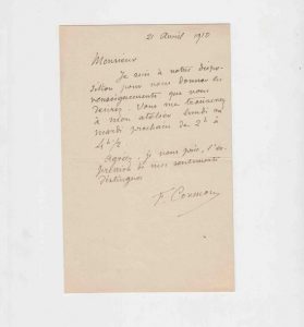 XIXe-XXe siècles. – Ensemble d'environ 90 lettres et pièces. – Baudry (Paul). Lettre autographe signée à un « cher ami ». [En mer], « en vue des côtes de France », 7 mai 1877. « J'envoie à Garnier par g[ran]de vitesse 2 régimes de bananes de Chine cueillies par notre ami Ali Pacha Chérif... J'ai visité la H[au]te Égypte en compagnie de Mariette Bey... Tu sais la beauté de Thèbes et de Philé où s'est arrêté notre voyage. Au retour, j'ai un peu peint et j'ai à peu près fait l'image d'une fille de fellah, les pieds ornés d'anneaux d'argent jusqu'à sa tête parfumée à l'huile de ricin... ». – Bonnat (Léon). Lettre autographe signée à Henry Roujon. Gérardmer, 19 septembre 1892. Concernant son portrait du cardinal Charles Lavigerie. – Bouguereau (William). Lettre autographe signée. Paris, 16 novembre 1890. Il décline une proposition. – Cabanel (Alexandre). Lettre autographe signée à Charles-Philippe de Chennevières. Paris, 18 juillet 1875. Concernant les modifications à apporter au règlement des expositions. – Carrière (Eugène). Lettre autographe signée au critique d'art Jules Rais. Mons, 8 novembre 1904. Concernant l'illustration du menu du banquet organisé en son honneur par Élie Faure le 24 novembre.– Chasseriau (Théodore). Lettre autographe signée à un « cher Monsieur ». S.l., 20 juillet 1853. Concernant la reproduction photographique de son tableau du Salon, Le tépidarium. – Cogniet (Léon). Lettre autographe signée. S.l., 4 décembre 1844. Lettre indiquant des inexactitudes concernant sa personne et son œuvre parues dans une gazette. – Constant (Benjamin). Lettre autographe signée [à l'écrivain voyageur Edmond About, d'après une note postérieure au crayon]. Paris, 12 mai 1884. « Ce que vous avez dit de mes "Chérifas" dans votre Salon d'hier m'a profondément touché... » Il donne ensuite l'explication du terme arabe, et porte une insulte antisémite contre le critique du Figaro, Albert Wolff. – Cormon (Fernand). Lettre autographe signée [à Henri Roujon, d'après une note postérieure au crayon]. S.l.n.d. Sur une vente de charité à laquelle participent aussi Jean-Baptiste-Antoine Guillemet, Henri Harpignies, Alfred Roll, et pour laquelle Auguste Rodin va être sollicité. – Detaille (Édouard). Lettre autographe signée [probablement à Gustave Larroumet] . S.l., 16 mai 1890. Il propose de rendre la carabine Spencer que celui-ci lui a offerte et explique qu'il en possède déjà une. – Deveria (Achille). Lettre autographe signée à Luc Granger. Versailles, 7 mai 1836. « ... S'il peut venir vers 11 heures samedi jusque vers 3 ou 4, j'aimerais mieux ça que plus tard parce que le soleil entre dans nos ateliers vers cette heure et que ça change l'effet... » – Dignimont (André). Lettre autographe signée à Jean Lacassagne. Paris, « dimanche ». « ... J'ai vu avant-hier le directeur de cette plaquette qui doit paraître sur la prostitution et dont je vous ai parlé [Frédéric Drach, qui a dirigé l'ouvrage Traite des blanches et prostitutions, dans Témoignages de notre temps, n° 4, Paris, 1933]. je lui ai dit que vous étiez le seul homme au courant de la question. Je l'ai décidé à faire le voyage de Lyon pour vous rencontrer. Je lui ai dit que vous le piloteriez au musée de votre père [le Musée d'histoire de la médecine et de la pharmacie, fondé par le docteur Alexandre Lacassagne], à l'hôpital, à la prison et aux bouics lyonnais... » (sur un feuillet illustré d'une gravure sur bois représentant une scène de bordel, mouillure angulaire). Vénérologue, Jean Lacassagne fut également médecin en milieu carcéral, et publia divers ouvrages, notamment d'histoire de la médecine – Hebert (Ernest). Lettre autographe signée à Adolphe Goupil. Rome, 24 janvier 1870. « ... La loi de destruction de tout ce qui est pittoresque commence à se faire sentir aussi à Rome. Le jour où je suis venu au Lavatore del Papa pour exécuter le tableau de laveuses, j'ai trouvé un joli toit en zinc porté par des colonnettes en fer creux, un escalier irréprochable, des lanternes à gaz, enfin tout ce que je déteste le plus ; je me suis donc retiré le cœur navré de ce nouvel échec, de cette disparition d'un coin plein de caractère devant la civilisation moderne... ». – Johannot (Alfred). Pièce autographe signée. S.l.n.d. « J'autorise madame Jobey à faire des croquis d'après mes tableaux qui se trouvent au Salon... » – Legrand (Louis). Lettre autographe signée au collectionneur d'estampes Alfred Barrion. S.l., « lundi ». « ... Le dessin pluviôse ne me sera pas utile pour le reproduire, ayant sous la main la même personne qui m'a posé & qui me servira pour en faire la gravure... En attendant que je vous en envoie une épreuve, je vous expédie "Après" & 2 autres que je vous avais promises... "Je me rappelle avoir fait "Avant" & "Après", mais je n'ai sûrement pas fait "Pendant" "... Je profite de l'occasion pour vous communiquer les dessins érotiques dont je vous ai parlé que je néglige d'éditer dans la crainte de Mrs aux bonnets-carrés... » – Merson (Luc-Olivier). 57 cartes (56 autographes signées et une autographe) adressées à l'artiste-peintre Marcelle Lambrette. Châtel-Guyon, 23 juillet-23 août 1913, puis Bourbon-L'Archambault, 28 août-19 septembre 1913. Billets amicaux laconiques et humoristiques écrits alors que le peintre suivait des cures en stations thermales. – Renoux (Charles Caïus). Lettre autographe signée. S.l., 1839. « ... Je travaille comme un enragé. J'espère avoir fini pour la fin de cette semaine et de suite je ferai mon envoi... » Suit la notice de deux de ses tableaux, Meg Merrilies (d'après Walter Scott), et Vue intérieure du château de Venasque près le mont Maudit, Hautes-Pyrénées. – Robida (Albert). Lettre autographe signée. S.l., « lundi 29 juillet ». « Je vois maintenant que je ne pou