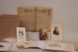 XVIIIe-XXe siècles. – Ensemble d'environ 150 pièces. – Portraits d’écrivains, d'artistes et de musiciens. Notamment un portrait de Colette gravé à l'eau-forte par André Dignimont, avec mention autographe signée de l'écrivain, « Je n'ai pas mérité ça. C'est affreux !... » – Suites illustrées pour des ouvrages littéraires. L'Ensorcelée, Le Chevalier Des Touches et La Vieille maîtresse de Jules Barbey d'Aurevilly (par Félix Buhot), Salammbô de Gustave Flaubert (par Gaston Bussière, Georges Rochegrosse, et Pierre Vidal), Les Noces corinthiennes d'Anatole France (par Serge Solomko). – Taurel (André Benoit Barreau). Plaque de cuivre originale gravée au burin, et estampe correspondante. 1824. Portrait du poète Jean-Baptiste Rousseau. – Bertrand (Louis). Nuits d'Alger. [Paris], Ernest Flammarion, 1929. In-4, broché. Édition originale, un des 40 exemplaires numérotés hors commerce, celui-ci sur vélin de Rives avec suite sur japon. Illustration de 21 lithographies d'André Suréda, soit une sur la couverture, une en frontispice, et 19 dans le texte. Exemplaire enrichi de 6 planches en tirages d'état sur différents papiers (parmi lesquelles 3 du frontispice dont une avec bon à tirer autographe signé de l'artiste) ; 2 tirages d'état d'une composition refusée du frontispice. – Commanville (Caroline). Souvenirs sur Gustave Flaubert. Paris, A. Ferroud, 1895. In-8, broché. Illustration gravée sur cuivre d'après des dessins de l'auteur, nièce de Flaubert. Exemplaire hors justification avec envoi autographe signé de l'éditeur Albert Ferroud à la rédaction du Journal des débats. – [Puech (Denys)] : Jaudon (Henry). Denys Puech et son œuvre. Rodez, E. Carrère, 1908. Grand in-4, broché. Édition originale. Nombreuses reproductions photographiques hors texte et dans le texte. Exemplaire enrichi de 2 des galvanotypes originaux ayant servi à l'illustration de l'ouvrage : Denys Puech au milieu de ses élèves à la villa Médicis (tiré p. 78), et Denys Puech dans les jardins de la villa Médicis (tiré p. 92). – Etc.