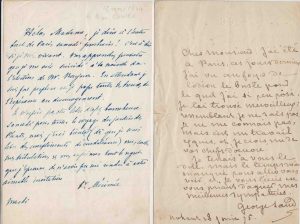 XIXe siècle. – Ensemble de 28 lettres et pièces. – Barres (Maurice). Lettre autographe signée. S.l.n.d. « Il faut autant que possible participer à toutes les passions de son siècle : vous avez bien raison de collectionner. Mais si je cherchais des autographes, je m'attacherais spécialement à rassembler les lettres amoureuses de tant de femmes jeunes et ardentes qui troublent et amollissent l'imagination aux historiens. À manier ces feuillets hâtifs où tant de créatures parfaitement douées, – de Marie Stuart à Marie Bashkirtsef – se sont avouées, vous trouveriez... un plaisir très fin, presque sensuel et un peu triste... » – Bouilhet (Louis). Lettre autographe signée à son « cher Depret ». Mantes, 10 août 1862. Il évoque sa pièce Dolorès en répétition à la Comédie-Française, et lui communique un de ses poèmes : « Le soir a tendu ses voiles... » (7 quatrains d'heptasyllabes). L'écrivain Louis Bouilhet fut un ami intime de Gustave Flaubert qui eut à cœur de publier ses œuvres après sa mort. – Claretie (Jules). Lettre autographe signée au peintre et sculpteur Jean-Paul Laurens. Viroflay, 3 juin 1883. Au sujet de ses compositions sur les Récits mérovingiens d'Augustin Thierry (traces d'humidité). – Claretie (Jules). Lettre autographe signée [probablement au bibliophile Octave Uzanne]. S.l., 13 mars 1893. Concernant entre autres un relieur qui a utilisé de la peau humaine. – Dumas fils (Alexandre). Pièce signée. Paris, 10 juillet 1894. Autorisation de représenter une pièce de son père, La Tour de Nesles, au Théâtre Moncey. – Houssaye (Henry). Lettre autographe signée [à Pierre Louÿs].S.l., [1906]. « Je vous remercie pour votre Archipel que j'ai visité avec grand plaisir. Peut-être vous surprendrai-je un peu si je vous dis que je suis du même sentiment que vous sur beaucoup de points des questions traitées aux pages 143-193 [essai intitulé « Liberté pour l'amour et pour le mariage », paru dans le recueil Archipel de Pierre Louÿs]. – Houssaye (Henry). Aphorisme autographe signé. « L'histoire de Napoléon depuis le siège de Toulon jusqu'à la bataille de Waterloo, c'est la vie de la France pendant son âge héroïque. Le récit des guerres de la Révolution et de l'Empire, c'est l'épopée nationale, c'est notre Iliade... » – Leconte de Lisle. Lettre autographe signée à François Coppée. Paris, 9 février 1877. « J'ai reçu L'Exilée, et je vous remercie bien cordialement de votre beau présent. J'avais déjà lu et j'ai relu avec un vif plaisir ces vers charmants, tendres, délicats et habiles, comme tous ceux que vous faites... » – Loti (Julien Viaud, dit Pierre). Carte autographe signée [à Rodolphe Salis]. Bordeaux, 11 janvier 1890. Il décline une invitation au Chat noir. – Merimée (Prosper). Lettre autographe signée [à madame Cuvier, d'après une note postérieure au crayon]. S.l., « mardi ». « ... Vous apprendrez peut-être que je me suis suicidé à la nouvelle de l'élection de Mr Bonjour. En attendant, je suis fort perplexe et je passe toutes les heures de l'espérance au découragement... » Casimir Bonjour présenta plusieurs fois sa candidature à l'Académie française mais n'y parvint jamais. – Michelet (Jules). Lettre autographe signée à monsieur Didier. S.l.n.d. Concernant des critiques sur ce qu'il a écrit concernant le maréchal Berthier. « Nul détail qui ne soit fondé sur des récits contemporains. Pensez-vous que la famille aient gardé des pièces capables d'infirmer ces récits ?... » – Murger (Henry). Lettre autographe signée à sa « chère mignonne ». Étretat, « 30 ». « ... Si ma nouvelle est finie au 10, je m'arrangerai pour que tu reviennes me chercher. Nous irons faire un petit tour sur les bords de la mer... » – Regnier (Henri de). Lettre autographe signée au poète et critique Jean-Frédéric-Émile Aubry dit Georges JeanAubry. Paris, 29 juin 1901. « ... Je n'ai pas pu encore montrer les vers à M. de Heredia parce, ces temps-ci, il a changé d'appartement et est allé s'installer à la bibliothèque de l'Arsenal, mais je les lui porterai bientôt. Quant à sa préface, l'obstacle le plus sérieux sera sa paresse et le manque de temps... » – Rosny ainé (Joseph-Henri Boex dit J. H.). Manuscrit autographe signé du pseudonyme collectif qu'il employait avec son frère, « J. H. Rosny », intitulé « La cellule ». Méditation écrite à l'occasion d'une nuit dans un monastère, portant sur la foi, la macération, sur sa jeunesse déiste enfuie, et plus généralement sur « le prodigieux danger de l'homme seul avec ses machines et ses bêtes domestiques, ses pauvres monstres qu'une épidémie pourrait un jour exterminer tous ensemble, une épidémie de pourriture humaine... » (feuillets apprêtés pour l'impression puis remontés sur papier). Au verso du dernier feuillet, le nom de Jules Rosati, directeur de L'Écho de Paris, où le texte a sans doute été proposé et peut-être publié. – Sainte-Beuve (Charles-Augustin). Lettre autographe signée au critique Charles Magnin, alors conservateur à la Bibliothèque royale. S.l., 19 novembre 1844. Il demande l'édition originale des Poésies érotiques d'Évariste de Parny (1778) pour écrire un article dans la Revue des deux mondes. – Sand (Aurore Dupin, dite George). Lettre autographe signée « Aurore » à son « bon Gustave » [probablement son ami le docteur Gustave Papet]. S.l., « dimanche matin ». « Je suis malade..., ne venez pas dîner avec moi aujourd'hui. Mais mercredi prochain, si je ne suis pas crévée, nous serons tous aimables. Tout à vous... » – Sand (Aurore Dupin, dite George). Lettre autographe signée [au sculpteur Carrier-Belleuse]. Nohant, 18 juin 1875. « J'ai été à Paris, ces jours derniers. J'ai vu au foyer de l'Odéon le buste pour lequel j'ai si peu posé. Je l'ai trouvé merveilleux ; ressemblant, je ne