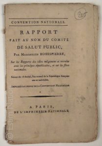 "Rapport fait au nom du Comité de Salut Public sur les rapports des idées religieuses et morales avec les principes républicains, et sur les fêtes nationales", Paris, Imprimerie Nationale, 18 floréal, an II, in-8, broché, 45 pages, EDITION ORIGINALE, très bon état.