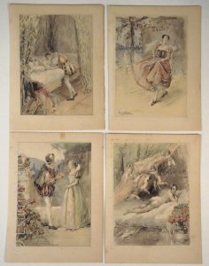Suite de quatre gravures en noir, 15 x 20 cm, impression sur beau papier épais, non daté, vers 1920-1930, scènes libertines ambiance XVIIe siècle. Très bon état.