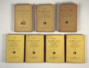 "OEuvres de Rabelais, édition conforme aux derniers textes revus par l'auteur, avec les variantes de toutes les éditions originales, avec notices, notes et glossaire", Paris, Flammarion, non daté, fin XIXe siècle, suite de sept volumes brochés, in-12, en bon état (volume 7 avec le dos défraichi).