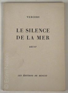 "Le silence de la mer" par Vercors, Paris, Editions de Minuit, 1944, première édition publique après l'édition clandestine sous l'occupation, in-12, broché, 87 pages, exemplaire numéroté sur vélin, très bon état.