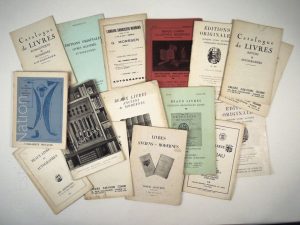 Ensemble de 16 catalogues à prix marqués de libraires parisiens des années 40-60 dont Gallimard, Lolliée, Damascène-Morgand, Edouard Loewy,en bon état.