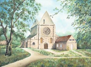 "Rosace d'abbaye" 38 x 28 cm, très bon état. Signature Henri Leclerc, artiste régional du Nord de la France, deuxième moitié du XXe siècle, ancien élève de l'Ecole des Beaux-Arts de Tourcoing et de l'Académie des Beaux-Arts de Mouscron en Belgique, très bon état.