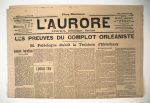 Exemplaire de l'époque de "L'Aurore", daté du jeudi 7 septembre 1899. En gros titre" Les preuves du complot orléaniste, M.Paléologue établit la trahison d'Esterhazy". En première page, article de Clémenceau (signé G.C.) "Dernières convulsions de la bête". En très bon état, sans déchirure ni rousseurs, papier en excellent état, non cassant, imprimé sur quatre pages. Le procès de Rennes s'est ouvert le 7 août 1899 pour se terminer le 9 septembre. Durant celui-ci, Esterhazy avouera la paternité du fameux bordereau qui accusait Dreyfus. Esterhazy avait trahi au profit de l'Allemagne pour de banales questions d'argent afin d'éponger ses dettes.