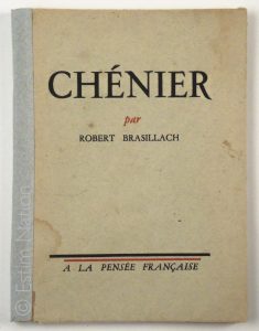 "Chénier", Robert Brasillach, à la pensée française, 1947, in-12 broché, édition originale clandestine, (l'E/O légale est parue 6 mois plus tard aux sept couleurs), 1/1600 ex sur vélin de Lana, 55 pages, dos restauré, mouillures claires en queue jusque la page 3