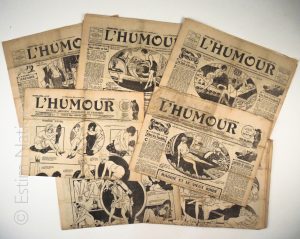 "L'humour", format tabloïd, ensemble de 18 numéros de cet hebdomadaire amusant, du N° 358 au N° 381(9/11/1923 au 24/04/1924), (manque n° 360 à 362, 365, 368, 376), 4 pages, numéros homogènes et sans coupures
