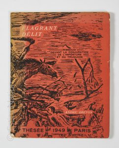 "Flagrant délit. Rimbaud devant la conjuration de l'imposture et du truquage." Paris, Thésée, 1949. Broché non coupé. Couverture illustrée de la reproduction de "La Guerre", lithographie réalisée par le douanier Rousseau. Edition originale non numérotée.