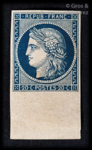 FRANCE Émission 1849 : N°8-20c BLEU SUR JAUNÂTRE NON ÉMIS, bord de feuille. Rare. Jolie pièce.