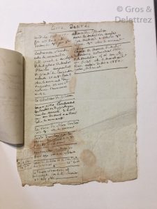 renseignements utiles à l’acquisition de ces volumes, le lieu où les trouver, le nombre de volumes et même leur prix. Le feuillet, rédigé à l’encre, est in-8 et possède quelques taches brunes. Il est accompagné d’un billet manuscrit, postérieur à la mort du marquis, donnant quelques indications sur le personnage qu’il était « Connu par les désordres de sa conduite et par des ouvrages infames… »