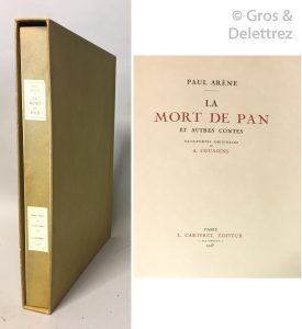 [COUSSENS] Paul ARENE. La Mort de Pan et autres contes. Paris, Carteret, 1945. In-4 en feuilles sous chemise rempliée et étui. Illustré de 20 eaux-fortes originales en couleurs de A. Coussens. Tiré à 200 exemplaires, un des 50 sur Japon...