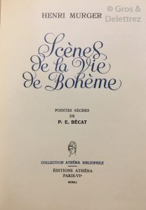 [BÉCAT] Henry MURGER. Scènes de la Vie de Bohême. Paris, Athéna, 1951, in-8 en feuilles sous couverture rempliée illustrée en couleurs et emboîtage, charnières fendues. Illustré de pointes-sèches en couleurs de Paul-Emile Bécat. Tirage...