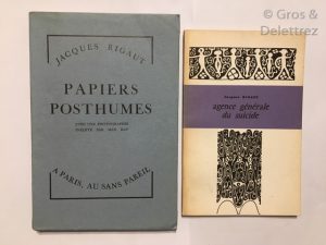 avec le portrait photographique de l’auteur par Man Ray. Il est joint l’ouvrage de Rigaut : « Agence générale du suicide », chez Pauvert, de 1960, en édition originale.